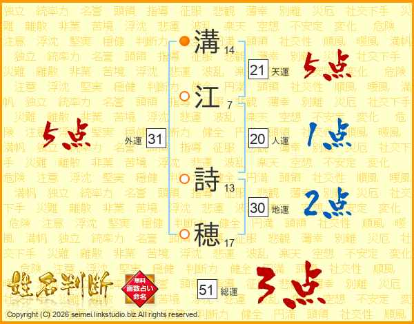 生活面を象徴する運勢です。外部から受ける影響力を表し、結婚運、家庭運や職場、環境への順応性を表します。総運から人運を引いた画数。姓や名が1文字の場合を除く。