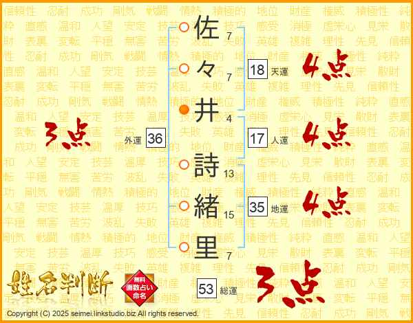 佐(7画)々(7画)井(4画) 詩(13画)緒(15画)里(7画)