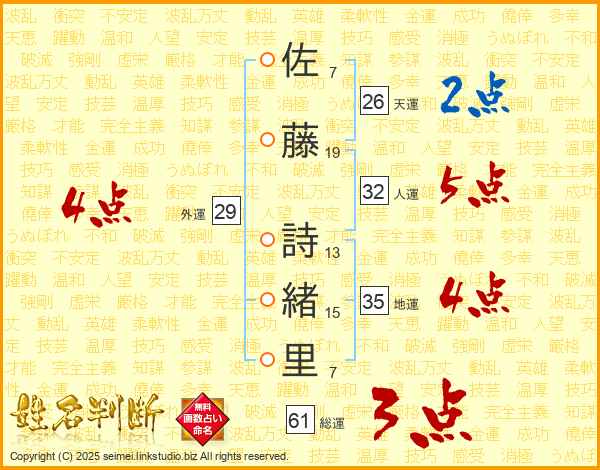 佐(7画)藤(19画) 詩(13画)緒(15画)里(7画)