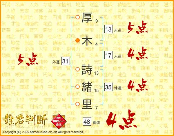 厚(9画)木(4画) 詩(13画)緒(15画)里(7画)