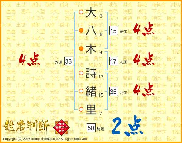 大(3画)八(8画)木(4画) 詩(13画)緒(15画)里(7画)