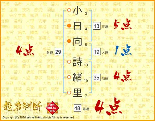 小(3画)日(4画)向(6画) 詩(13画)緒(15画)里(7画)