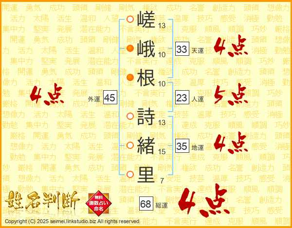 嵯(13画)峨(10画)根(10画) 詩(13画)緒(15画)里(7画)