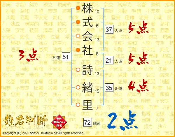 株(10画)式(6画)会(13画)社(8画) 詩(13画)緒(15画)里(7画)