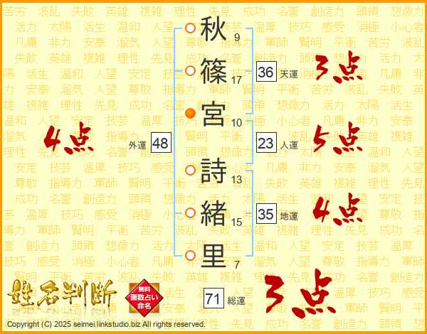 秋(9画)篠(17画)宮(10画) 詩(13画)緒(15画)里(7画)