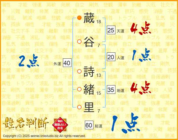 蔵(18画)谷(7画) 詩(13画)緒(15画)里(7画)