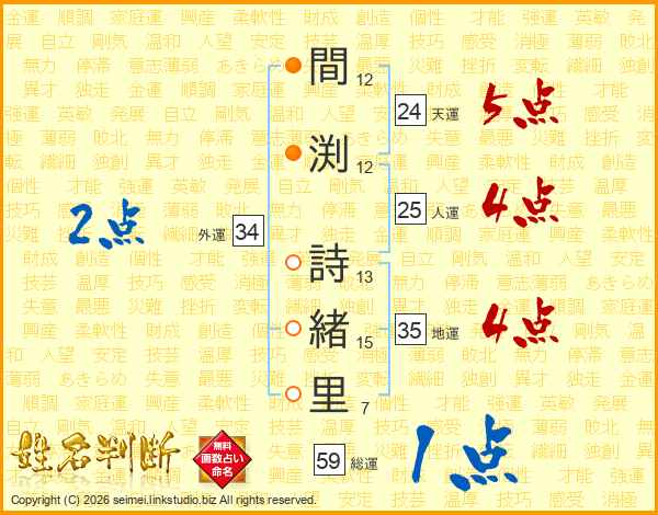 間(12画)渕(12画) 詩(13画)緒(15画)里(7画)