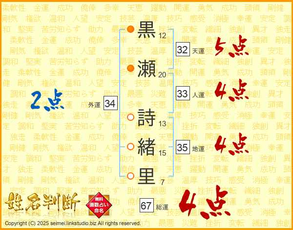 黒(12画)瀬(20画) 詩(13画)緒(15画)里(7画)
