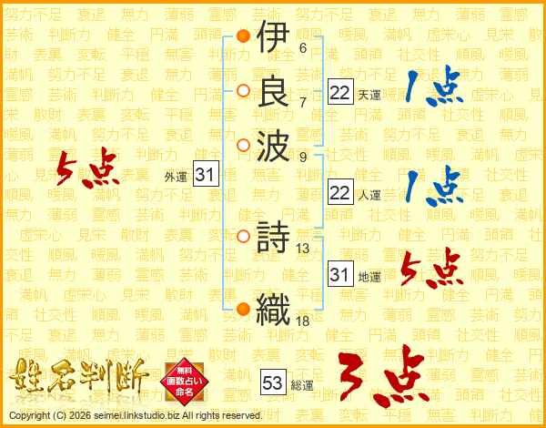 伊(6画)良(7画)波(9画) 詩(13画)織(18画)