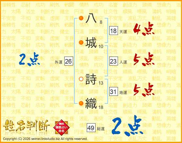生活面を象徴する運勢です。外部から受ける影響力を表し、結婚運、家庭運や職場、環境への順応性を表します。総運から人運を引いた画数。姓や名が1文字の場合を除く。