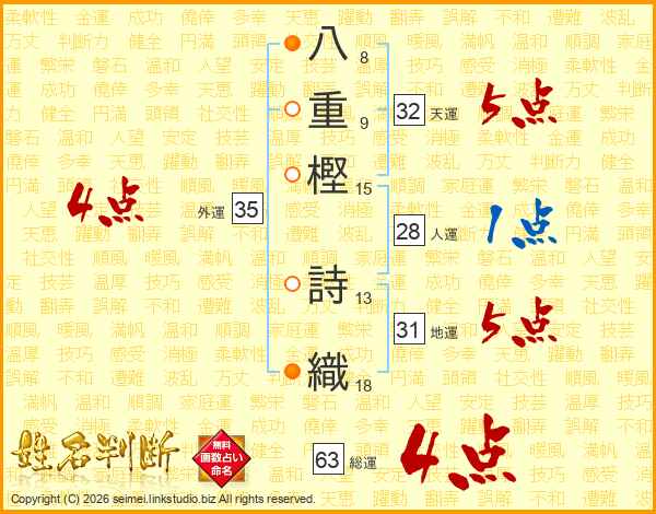 八(8画)重(9画)樫(15画) 詩(13画)織(18画)