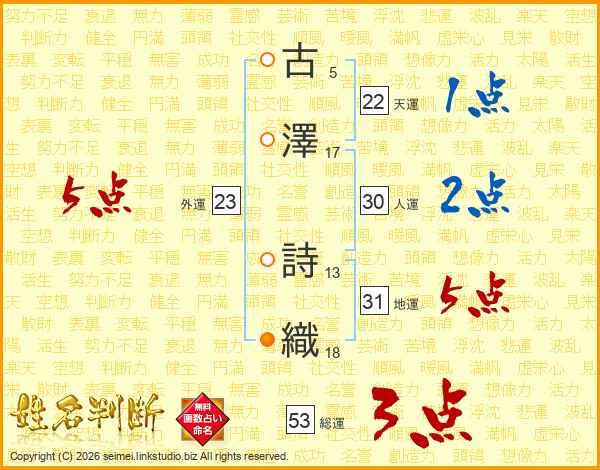 古(5画)澤(17画) 詩(13画)織(18画)