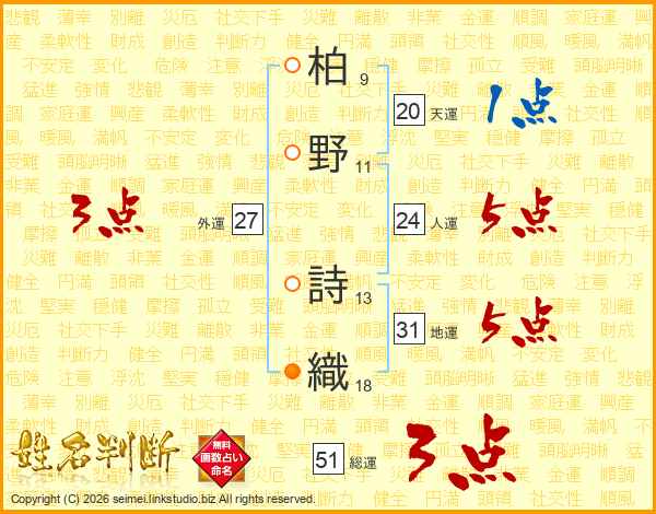生活面を象徴する運勢です。外部から受ける影響力を表し、結婚運、家庭運や職場、環境への順応性を表します。総運から人運を引いた画数。姓や名が1文字の場合を除く。