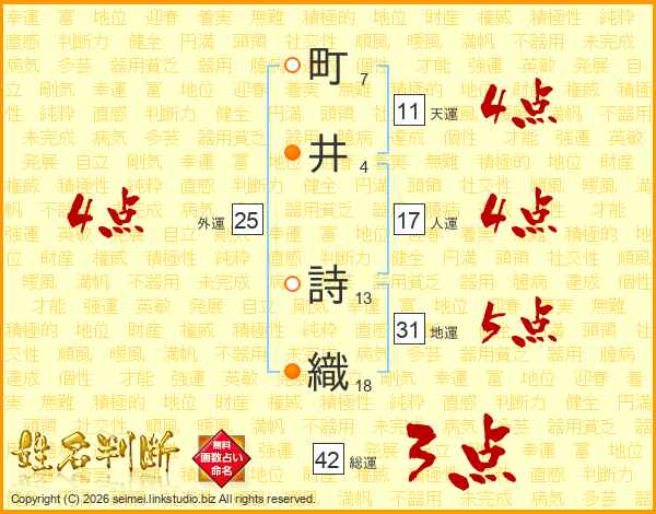 町(7画)井(4画) 詩(13画)織(18画)