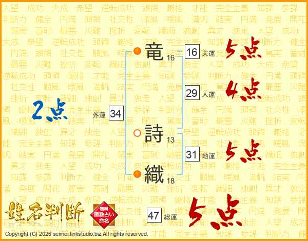 家系が持つ宿命的な運勢を表します。祖先から受け継いだ苗字ですので自分の力が及びません。家柄を象徴します。苗字の合計画数。