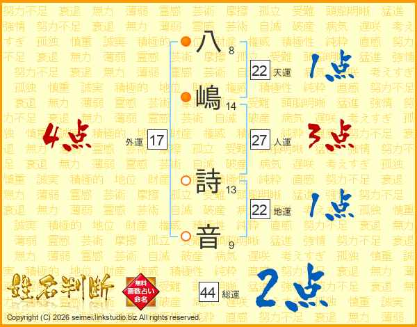 八(8画)嶋(14画) 詩(13画)音(9画)