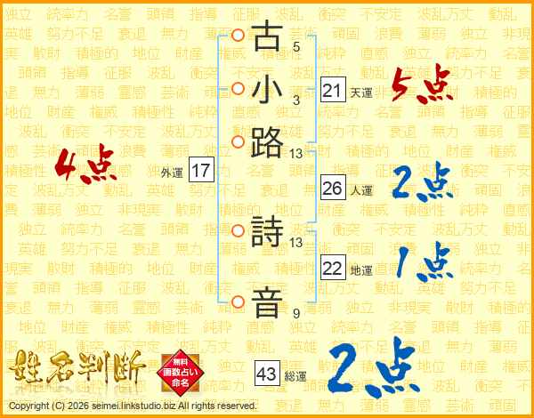 生活面を象徴する運勢です。外部から受ける影響力を表し、結婚運、家庭運や職場、環境への順応性を表します。総運から人運を引いた画数。姓や名が1文字の場合を除く。