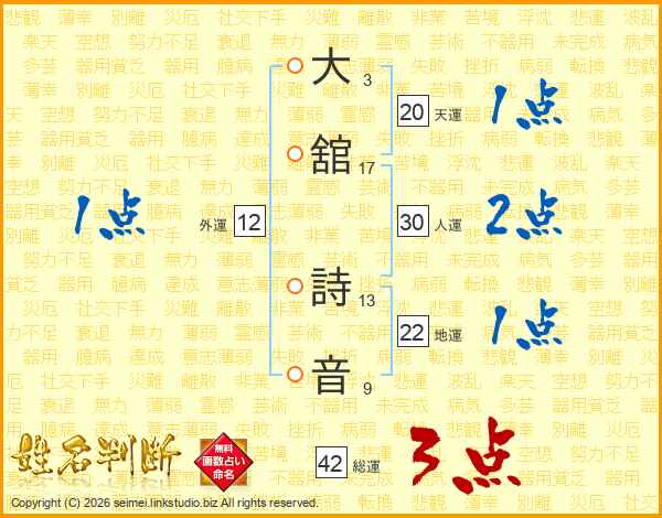 大(3画)舘(17画) 詩(13画)音(9画)