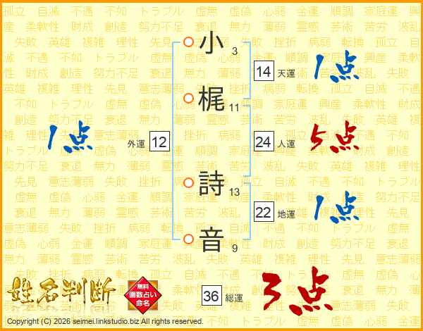 生活面を象徴する運勢です。外部から受ける影響力を表し、結婚運、家庭運や職場、環境への順応性を表します。総運から人運を引いた画数。姓や名が1文字の場合を除く。