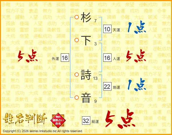 杉下詩音さんの総運は32画の5点!
