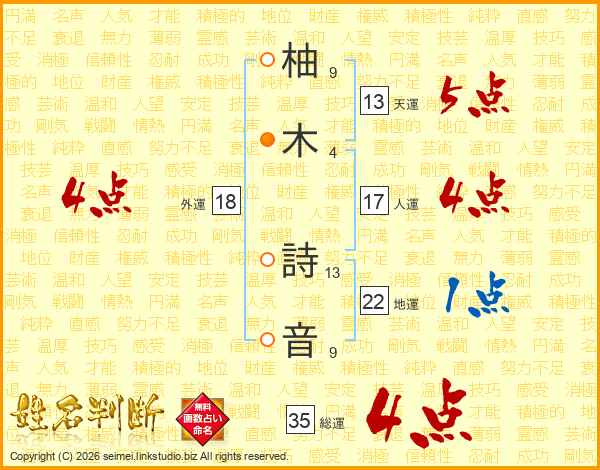 柚(9画)木(4画) 詩(13画)音(9画)