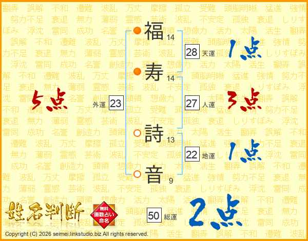 生活面を象徴する運勢です。外部から受ける影響力を表し、結婚運、家庭運や職場、環境への順応性を表します。総運から人運を引いた画数。姓や名が1文字の場合を除く。