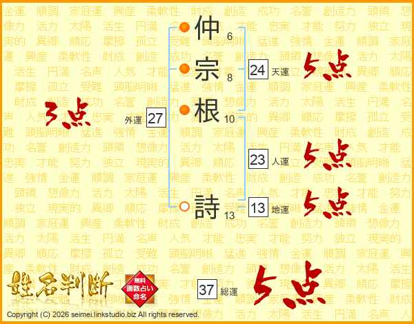 仲宗根詩さんの総運は37画の5点!