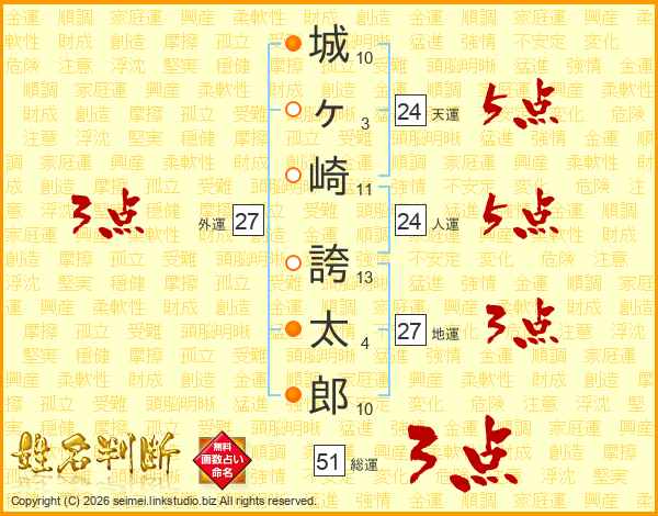 城ヶ崎誇太郎さんの総運は51画の3点!
