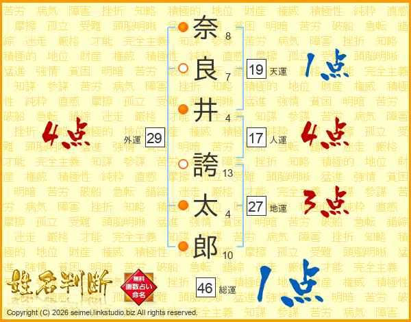 奈(8画)良(7画)井(4画) 誇(13画)太(4画)郎(10画)