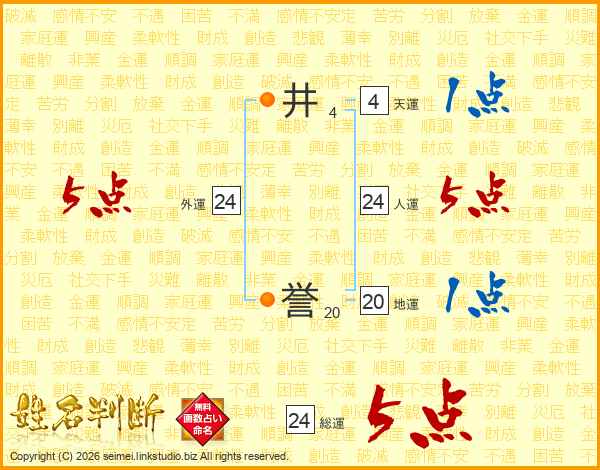 生活面を象徴する運勢です。外部から受ける影響力を表し、結婚運、家庭運や職場、環境への順応性を表します。総運から人運を引いた画数。姓や名が1文字の場合を除く。
