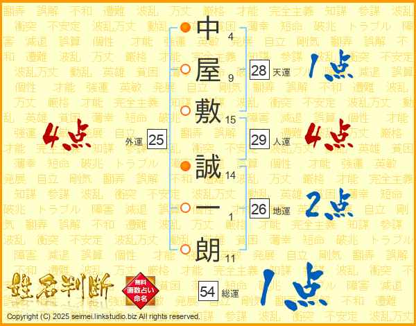 中(4画)屋(9画)敷(15画) 誠(14画)一(1画)朗(11画)