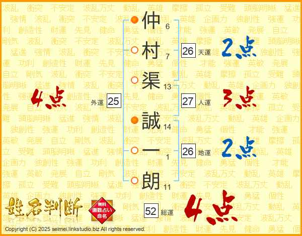 仲(6画)村(7画)渠(13画) 誠(14画)一(1画)朗(11画)