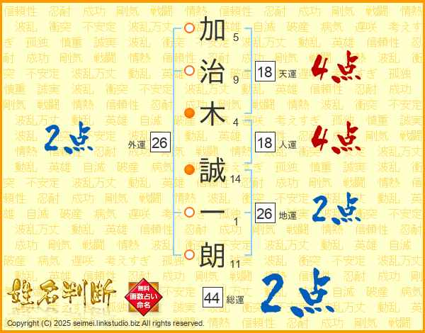 加(5画)治(9画)木(4画) 誠(14画)一(1画)朗(11画)