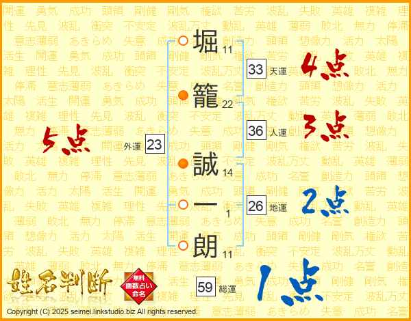 堀(11画)籠(22画) 誠(14画)一(1画)朗(11画)