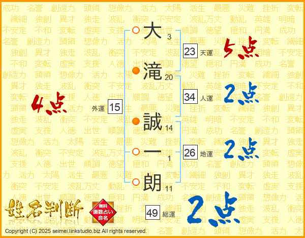 大(3画)滝(20画) 誠(14画)一(1画)朗(11画)