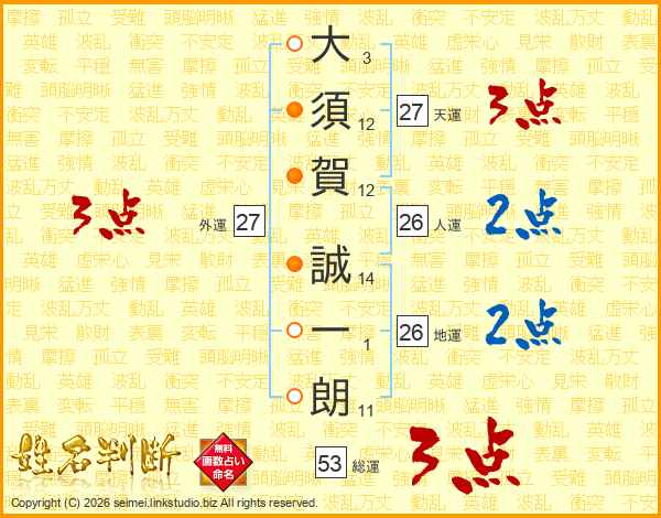 大(3画)須(12画)賀(12画) 誠(14画)一(1画)朗(11画)