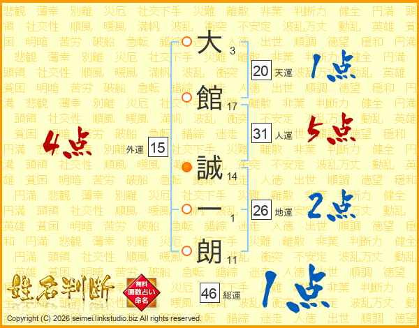 大(3画)館(17画) 誠(14画)一(1画)朗(11画)