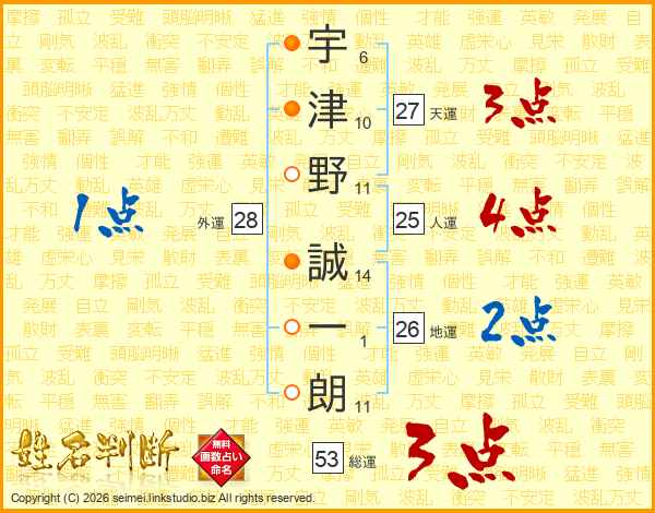 宇(6画)津(10画)野(11画) 誠(14画)一(1画)朗(11画)
