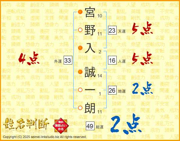 宮(10画)野(11画)入(2画) 誠(14画)一(1画)朗(11画)