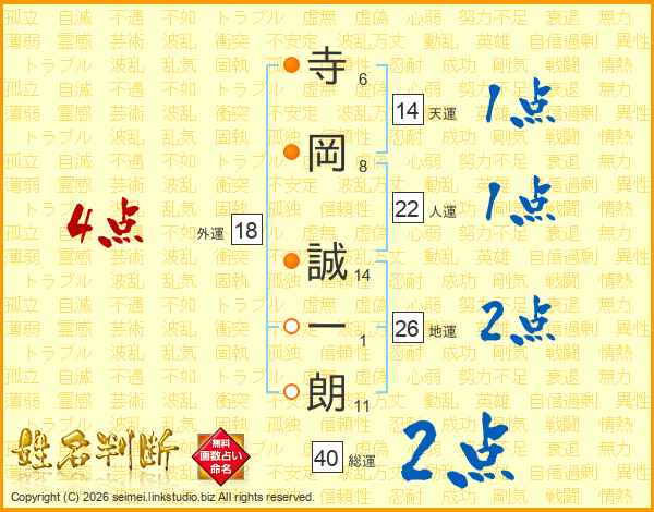 寺(6画)岡(8画) 誠(14画)一(1画)朗(11画)