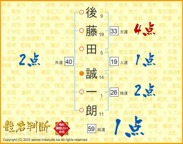 後(9画)藤(19画)田(5画) 誠(14画)一(1画)朗(11画)