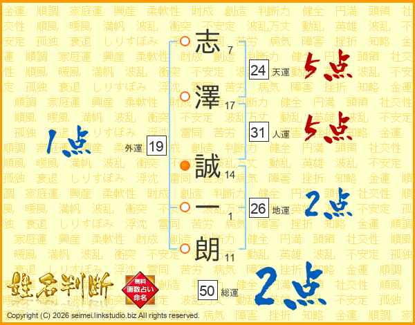 志(7画)澤(17画) 誠(14画)一(1画)朗(11画)