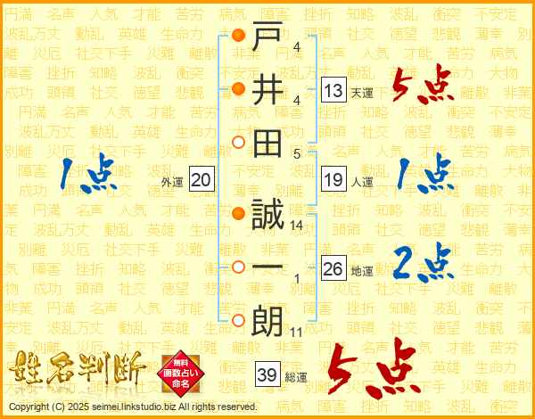 戸(4画)井(4画)田(5画) 誠(14画)一(1画)朗(11画)