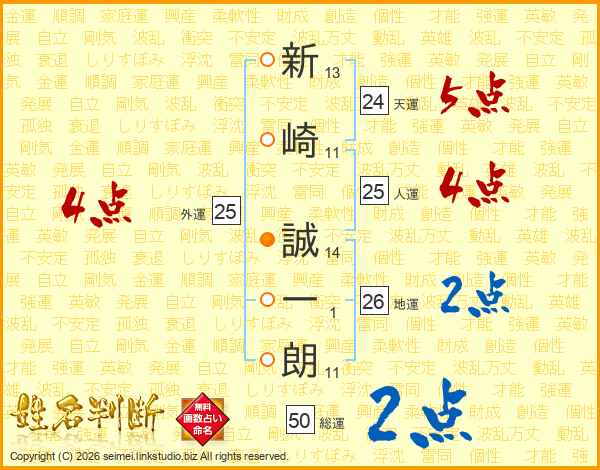 新(13画)崎(11画) 誠(14画)一(1画)朗(11画)