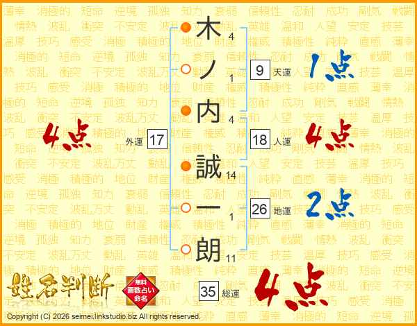 木(4画)ノ(1画)内(4画) 誠(14画)一(1画)朗(11画)