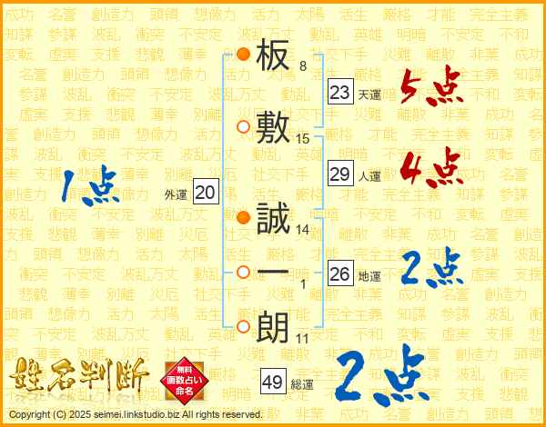 板(8画)敷(15画) 誠(14画)一(1画)朗(11画)