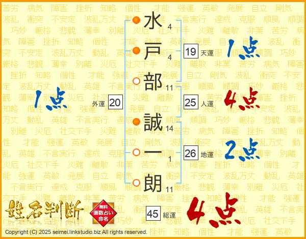 水(4画)戸(4画)部(11画) 誠(14画)一(1画)朗(11画)