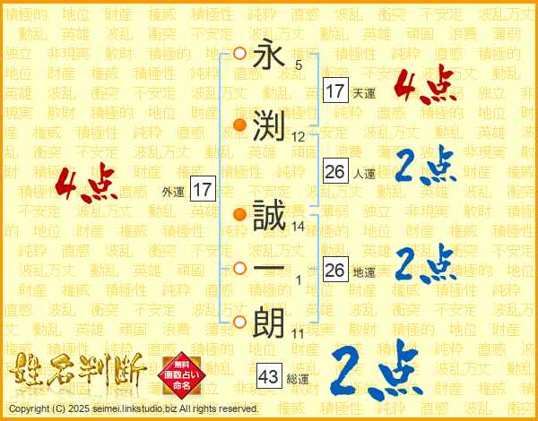 永(5画)渕(12画) 誠(14画)一(1画)朗(11画)