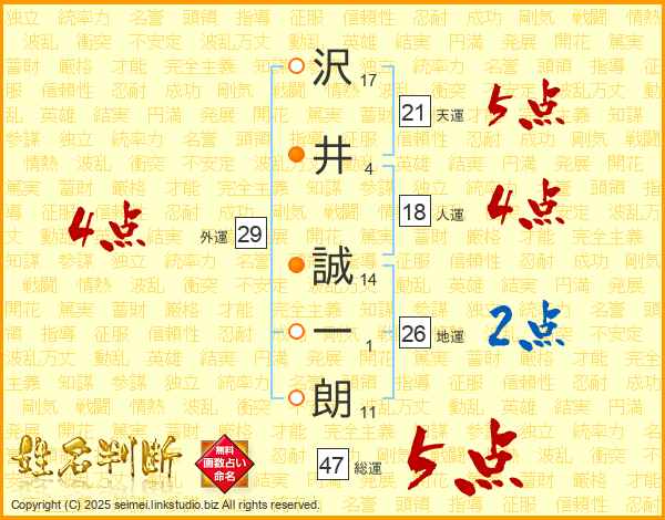 沢(17画)井(4画) 誠(14画)一(1画)朗(11画)