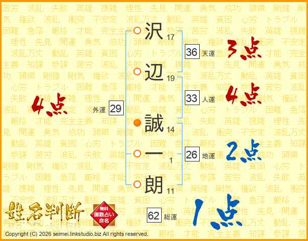 沢(17画)辺(19画) 誠(14画)一(1画)朗(11画)